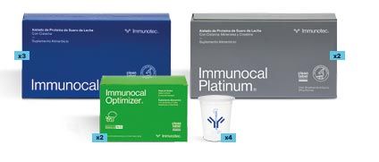 Incluye: 3 Immunocal Mx, 2 Immunocal Platinum, 2 Immunocal Optimizer R&V, 4 vasos